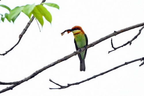 鉴别特征:全长约21厘米。额、头顶、枕及上背栗棕色;贯眼纹黑色,喉黄而缘栗色;腰及尾上覆羽蓝色;两翅及尾羽绿色;上胸具淡栗棕色与黑色相连的胸带斑;下体余部浅绿色;中央尾羽不延长。两性相似。