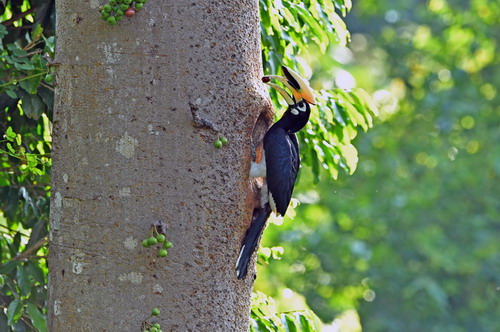 生态习性:喜欢在热带和亚热带常绿阔叶林边缘活动,也见于开阔的低海拔次生林等生境中。取食树上的果实,也捕食昆虫、蜥蜴、小型鸟类和啮齿类。繁殖期4~5月,在高大乔木的树洞中营巢,每窝产卵2~3枚。繁殖期雌鸟被封在洞内孵卵育雏,雄鸟在外觅食喂养,直到雏鸟快要离巢时,雌鸟才破洞而出。