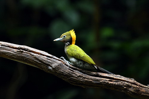 鉴别特征:全长约34厘米。雄鸟额、头顶和头侧呈橄榄绿色,缀有棕栗色;枕冠金黄色或橙黄色;上体亮绿色;颏、上喉及颚纹淡柠檬黄,下喉黑而具白纹;下体余部橄榄褐灰色;尾羽黑褐色。雌鸟与雄鸟相似,但颏、上喉及颚纹为棕褐色。
