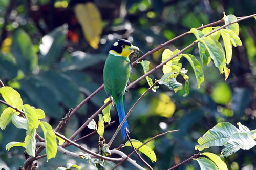 鉴别特征:全长约26厘米。嘴形宽阔而扁平;前额、头顶、枕部及耳羽亮黑色;头顶中央有一翠蓝色块斑;后枕两侧各有一鲜黄色斑;额、颊和喉部亮黄色;上体余部为鲜亮的草绿色;飞羽黑色并具钴蓝色翅斑;尾羽钴蓝色;下体余部淡蓝绿色。两性相似。