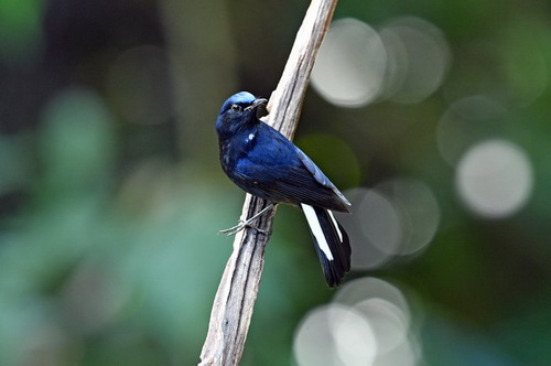 鉴别特征:全长约18厘米。雄鸟前额、眉纹及翅角覆羽呈亮钴蓝色;下颈两侧常显白斑;体羽大部为蓝黑色;翅和尾羽黑褐;尾羽较长,外侧尾羽具白斑。雌鸟体羽主要呈橄榄褐色,下体较淡,外侧尾羽基部也具白斑。