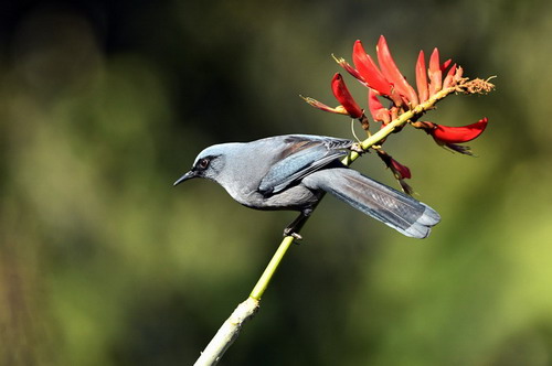 鉴别特征:全长约22厘米。上体蓝灰色,头顶略深并具金属光泽;前额和眼周黑色;耳羽杂黑色条纹;飞羽黑色具浅蓝灰色外缘;尾羽褐色;下体浅蓝灰并沾葡萄色。两性相似。