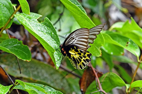 鉴别特征:雄蝶翅展约12厘米,雌蝶翅展可达15厘米,是中国最大的蝴蝶。体黑色,头、颈和胸侧有红毛,腹部黄色,有黑色横斑相间。雄蝶前翅黑色,翅脉两侧的灰白色鳞片明显;后翅金黄色,外缘具黑斑。雌蝶前翅中室内有4条纵纹较雄蝶显现;后翅除具雄蝶的黑色缘斑外,各室另有一枚三角形黑斑。