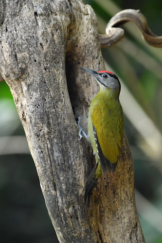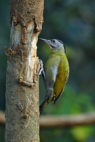 鉴别特征:全长约30 cm。上体绿色;飞羽及尾羽黑色,飞羽具白色横斑;下体橄榄绿或灰绿色,无斑纹;头侧灰色;眼先上部和颚纹黑色;雄鸟头顶前部红色,后部及枕部灰色而具黑色条纹,在后颈形成块斑。雌鸟头顶及枕部灰色,具黑色条纹。
