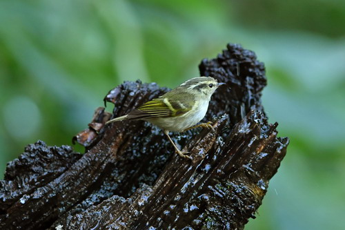 鉴别特征:全长约10cm。上体橄榄绿色;顶冠纹和眉纹绿黄色;腰柠檬黄色;翅和尾暗褐;翅上具两道黄色翅斑;体腹面近白色。两性相似。