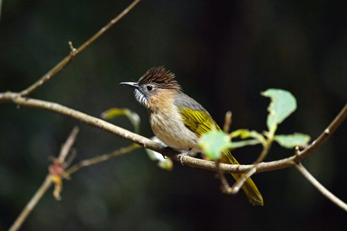 鉴别特征:全长约23cm。头顶栗褐色,羽毛尖形,具有浅色轴纹;上体深灰褐,颈侧染红棕;飞羽和尾羽的表面呈亮橄榄绿色;喉灰而具白色纵纹,羽端尖细;下体棕白,胸部浓暗;尾下覆羽呈浅黄色。两性相似。