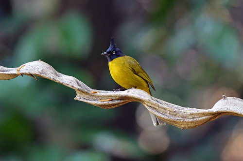 鉴别特征:全长约18cm。头黑色并具蓝色金属光泽,头顶有直立的黑色羽冠;上体橄榄黄绿色;尾羽暗橄榄色;下体鲜橄榄黄色;两性相似。