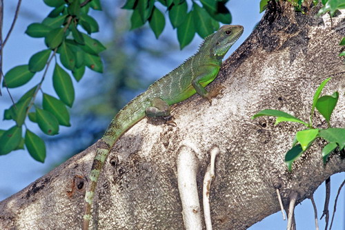 鉴别特征:体形较大,全长可达60 cm左右。自颈部沿背脊中央至尾部中段有一行极发达的鬣鳞。全身背部常为暗绿色,腋部为橘黄色,尾部有棕色和灰白色相间的环纹。体色可随周围环境及光线强弱而改变,所以又被称为“变色龙”。