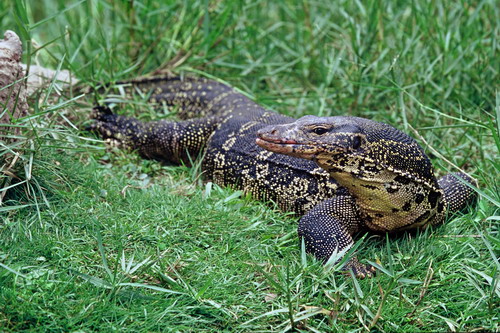 鉴别特征:成体体长可达2 m,体重约20 kg。头小吻尖,颈部较长。肢体粗壮,指、趾长有利爪,通体背面为乌黑色,杂以浅黄色圆形花斑。尾长而侧扁,有乳黄色与乌黑色相间的环形花斑。腹面为乳黄色。