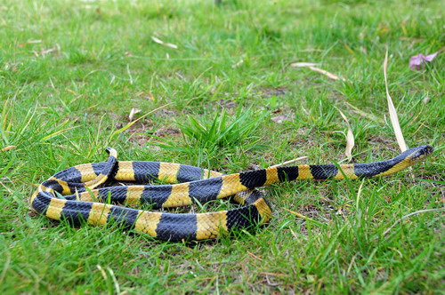 鉴别特征:前沟牙类剧毒蛇。体长多在1~1.5 m之间。头小呈椭圆形,与颈部略可区分;尾粗且短,末端圆钝;躯干圆柱形,背脊明显棱起,身体横截面呈特殊的三角形;通身黑色,有较宽的金黄色环纹。