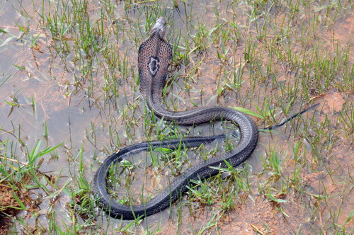 鉴别特征:前沟牙剧毒蛇。体长约1 m;头部椭圆形;体色暗褐或灰褐色;在颈部竖立膨扁时,颈背有内外镶黑褐色边的白色椭圆形“单眼斑”;躯干前部腹面两侧各有一暗褐色粗斑点,腹面前段黄白色,后段灰褐色。