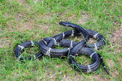 鉴别特征:体形中等偏大的无毒蛇。体修长,体长约1.3 m;头宽而扁平,与颈区别明显;体背面黑褐色,有大约等距离排列的白色窄横斑;腹面黄白色。