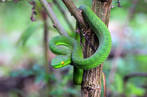 鉴别特征:体形中等的管牙类剧毒蛇。体长77~92 cm;头三角形,头、颈区分明显,头侧有颊窝,雄性眼红色;尾具缠绕性;通身以绿色为主,尾背及尾尖焦红色,体侧有红白各半的纵线纹,腹面浅黄白色。