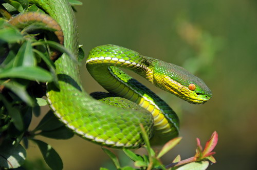 鉴别特征:体形中等的管牙类剧毒蛇。体长74~110 cm。头三角形,与颈区分明显;头侧有颊窝;尾具缠绕性;通体背面以绿色为主;雄性眼红色;上唇浅绿色;尾背及尾末焦红色;体两侧有一白色线纹自颈后延伸至肛前;腹面浅黄绿色。