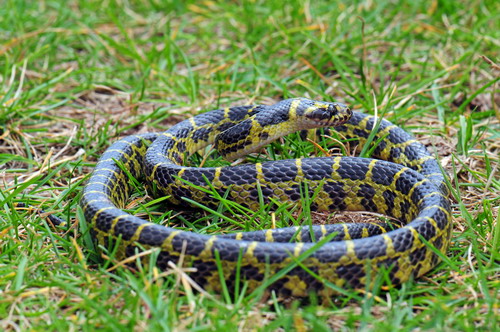 鉴别特征:体形中等偏大的无毒蛇。体修长,体长约1.1 m;头宽而扁平,与颈区别明显;枕背有倒“V”形黄色斑;体背面黑褐色,有大约等距离排列的黄色窄横斑;腹面污白色。