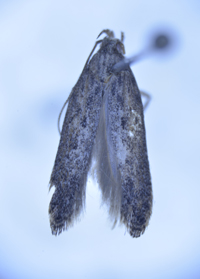 特征:成蛾体长5.0 -6.2mm,翅展14 - 16mm。灰褐色,稍带银灰光泽。触角丝状。下唇须3节,向上弯曲超过头顶,第1节短小,第2节下方被覆疏松、较宽的鳞片,第3节长度接近第2节,但尖细。前翅狭长,鳞片黄褐色。雌虫翅臀区鳞片黑色如斑纹。雄虫翅臀区无此黑斑,有4个黑褐色鳞片组成的斑点;后翅前缘基部具有1束长毛,翅缰1根。雌虫翅缰3根。雄虫腹部外表可见8节,第7节前缘两侧背方各生一丛