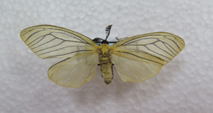 鉴别特征:头部黑色,触角黑褐色,栉齿状;胸部及腹部背面粉黄色,反面中央蓝色带黑,前翅淡黄色,翅面遮薄粉黄色鳞毛,翅前缘及翅脉灰黑色,翅面上有灰色细点;后翅淡黄色,翅面遮薄粉黄色鳞毛,翅脉淡灰色,翅前缘灰黑色。