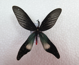 鉴别特征: 头、胸及腹部大部分红色,前翅基部有一红点;后翅翅基到翅顶蓝绿色。