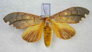 特征: 喙不发达;雄蛾触角双栉齿分支达2/3以上;前翅长而宽,前缘外半部拱形,翅顶钝,外缘斜具不规则缺刻,后缘中央前有一小齿形毛簇,M3与Cu1脉基部分离或有短共柄,M2脉从横脉中央伸出,具副室,M1脉从中室上角或副室后缘近中央伸出,Rs脉和R2、3、4脉同出于副室顶角;前翅外缘的缺刻不规则,中部两个大而深,横脉纹1个;胸部有长冠形毛簇;前翅M3与Cu1脉基部分离,胸部的毛刷棕红色;前翅后缘橘黄色。后翅黄褐色,前缘黄白色,后缘带赭色。