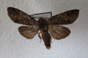 特征:下唇须黄褐色。头部与胸部黄褐色。腹部褐色。前翅浅红褐色,散布褐色鳞片;横线黑褐色,内线和外形波状,外衬浅色边;亚端线波状;端线细而直;横脉纹肾形,棕色有浅边框。后翅棕色。 抱器背基部无突起,爪形突宽长,爪形突中部变窄。