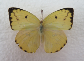 鉴别特征: 根据翅反面银斑的有无,可分为有纹型和无纹型两大类。有纹型前翅反面中室端有1个眼斑,后翅反面中室端有2个眼斑。无纹型翅反面无眼斑,触角黑色,雌、雄体均小于有纹型。两型成虫胸部均黑色,覆盖灰黄色毛。雄虫翅基半部黄色,端半部白色,前翅顶角翅缘为黑色,反面后缘基半部有1列黄色长毛;后翅正面中室基上部有1个月牙形黄白色斑。雌虫翅黄色或仅基半部黄色;前翅前缘和外缘呈黑带或黑锯齿状带;有的亚外缘区有1列黑斑,中室端有1个黑色圆斑;后翅外缘有1列黑斑或呈黑带状。