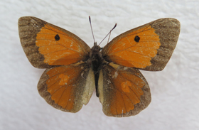 鉴别特征:本种雌雄异型。翅为橙黄色,前后翅外缘的黑带较宽,雌蝶带中有橙色斑,雄蝶则无,前后翅中室端的黑点和橙黄点较大。