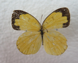 鉴别特征:翅深黄色到黄白色。前翅外缘有宽黑色带,直到后角,界限清晰,黑色带内侧于M3脉与Cu1b脉处凹陷,在Cu1a脉处略突出,呈齿状。雄蝶色深,中室下脉两侧有长形性斑;后翅外缘黑色带窄且界限模糊,或有脉端斑点。翅反面布满褐色小点,前翅中室内有2个斑纹;后翅因M3室外缘略突出呈不规则圆弧形。