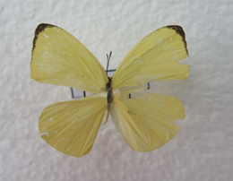 鉴别特征:雄蝶翅面柠檬黄色,雌蝶白色,前翅顶角及外缘黑带狭窄,翅反面黄白色,无斑纹。