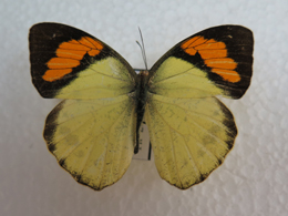 鉴别特征:雄雌异型,雄蝶前翅正面端半部黑色,其中域有大型橙色斑,基半部及后缘附近为黄色,中室端脉斑黑色,后翅外缘黑色,其余均为黄色,后翅反面黄色。雌蝶前翅黑色,中室端具白色或黄白色斜带(有时斜带只隐约可见);后翅外缘黑色部分比雄蝶宽阔,基半部白色;前翅反面淡黄色,臀角附近黑色,基部白色;后翅反面淡黄色,前后翅反面密布黑线点。