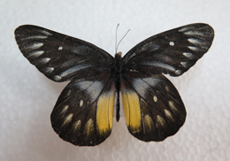 鉴别特征:前翅正面黑色,各翅室有界限模糊的白色长卵形斑,后翅正面翅基红色、中域白色,被黑色翅脉分割,外缘黑色,分布有白点,臀区漆黄色,前后翅反面同正面,中部有白色斜带,后翅基红色部分显著,中域带淡黄色。