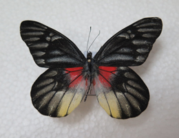 鉴别特征:翅面淡黑色,各室苍白色长斑纹上散有黑色鳞粉,中室端脉白斑呈飞鸟形,后翅基部朱红色,翅反面色斑同正面,仅白斑鲜显,臀室斑白黄色。