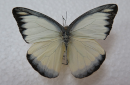 鉴别特征:雄蝶翅正面白色,前翅前缘黑色,外缘黑带内侧呈齿状,后翅外缘浅黑色,前翅反面前缘黑带稍深,顶角有一个卵形黄斑,后翅反面黄色,外缘黑带宽而深黑。雌蝶翅正面深褐色或黑色,两翅各室有灰白色条斑,后翅臀缘白色,反面前翅除中室内有一 个明显白斑,其余同正面。后翅外缘有较宽的黑色带,其余部分为黄色。