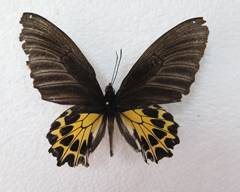 鉴别特征:大型凤蝶。雄蝶前翅面天鹅绒黑色,脉边有灰色条纹;后翅面金黄色,有相连的锐三角形黑色缘斑(有的标本近臂角处黑色缘斑不连接)。雌蝶大于雄蝶,前翅面与雄蝶相似,但金黄色后翅面多1列亚缘斑,而斑与斑之间微相连接。
