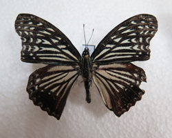 鉴别特征:翅面黑色,有许多不规则尖形白斑;前翅中室内白斑分开,有2中列、1亚端列、1亚缘列白斑,后缘1室有2平行白条纹;后翅基半部脉间白色,端部有亚缘及缘小白斑列。翅反面与正面相似,但前翅顶角、后半部及后翅端区呈深褐色。