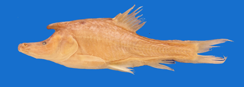 鉴别特征:体侧扁,头前部略平扁,吻极度向前突出,端部略上翘,头后部急剧隆起,枕嵴扩大,形成一朝前的角状突,顶有一肉瘤,口亚下位,呈马蹄形,唇薄,须2对,腹鳍基无腋鳞。侧线完全,有侧线鳞,侧线上下鳞片退化。背鳍末根不分枝鳍条基部粗硬,后缘具锯齿,末端柔软分节。