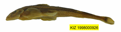 鉴别特征:身体和尾柄细长,前部纵扁,后部略侧扁;背缘微隆起,腹面平直。眼小,背位。口横裂,下位,下颌齿带分为左右两块。下唇发达,其表面后缘有一些小乳突。腹面有羽状褶皱,后缘完全。胸鳍无硬刺,胸鳍鳍条后伸超过腹鳍,胸鳍及腹鳍第一根鳍条平展,腹面有羽状褶皱。脂鳍基长,靠近背鳍。尾鳍微凹。头背部灰色,有浅黄色小斑点,腹部浅黄色。脂鳍浅黄色,背鳍和臀鳍浅黄色带灰色条纹,胸鳍和腹鳍灰色,尾鳍前部浅黄色,后缘深灰色。