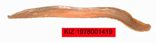 鉴别特征:体细长,鳗形,前半部分呈圆柱形,后渐侧扁。背、腹缘轮廓呈浅弧形。头尖突,吻部具有一柔软吻突。前后鼻孔距离远,前鼻孔端部具2个指状突和2个宽鼻瓣;后鼻孔长椭圆形,近眼前缘。眼小,侧上位,眼下刺伸达眼前缘。口下位,上颌后端伸达后鼻孔垂直下方。上、下颌具尖锐细齿多行,形成齿带。上、下唇发达,唇后沟在颏部中断。背鳍低长,起点约位于胸鳍中部上方,鳍棘部长大于鳍条部长,鳍棘短小,游离。臀鳍起点位于背鳍倒数第3~4鳍棘下方,距尾鳍基近于距吻端,鳍棘短小,第二鳍棘较大。背鳍、臀鳍、尾鳍几乎愈合。胸鳍短小,扇圆形,起点紧靠鳃孔,基部上缘高于鳃孔上角。腹鳍消失。肛门至臀鳍起点约为眼径的2倍。尾鳍圆形。吻前部及背面、头背面和鳃峡无鳞,头的其余部分及体被细小圆鳞。侧线明显,完整。无鳃耙和假鳃。身体和背部深褐色,腹部灰色,具深褐色条纹。