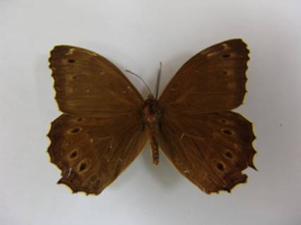 4. 后翅里基部有3个黄色小圆斑,其中前缘1个变成1深褐色圆斑;前缘1“> <”状褐色斑纹非常明显;亚缘眼纹大,其中1b室的1个最大,而第3和7室的最小。