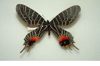 鉴别特征:本亚种与盈江亚种B. lidderdalii yingjiangi L.相似,主要区别如下:翅底色纯黑色,线状纹灰白色。前翅顶角浑圆,第4-6室外缘明显突出,前半部线纹间的距离差异明显,第3-4线纹之间的距离为8mm,2-3线纹之间的距离为4mm,线纹5-6之间的距离为6mm。后翅外缘深凹、尾突更尖出,臀区外缘橙黄色斑大而明显。