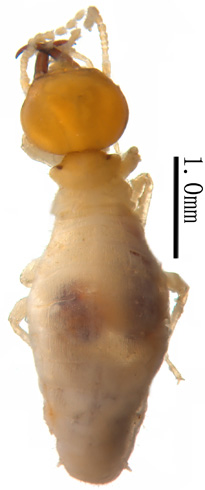 鉴别特征:本种兵蚁个体与黄球白蚁G. sulphureus (Haviland) 较近似,但:1. 本种头形几近圆形,头后缘呈弧状凸出,头壳指数平均值为0.927,黄球白蚁后缘近平直,头壳指数平均值为0.935;2. 本种左上颚缘齿至颚端距离为0.45-0.52,缘齿略大于右上颚缘齿,而黄球白蚁缘齿至颚端距离仅0.31-0.44,且左,右缘齿大小相同;3. 本种前胸背板大于黄球白蚁。