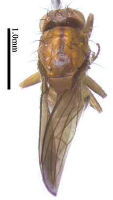 Diagnosis: Dull brown species, with cercus fused to epandrium at submedian portion. Or 2 ca. 4/9 length of Or 1. C3-fringe ca 5/9. Lobe of ovipositor with many irregular teeth. Spermatheca slender, with sparce oblique lines on basal 1/3 of outer capsule.