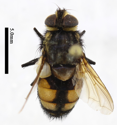 Remark: This species is characteristic in its golden yellow pollinose body and broadly reddish abdomen in ground color.