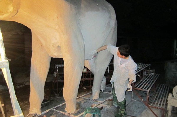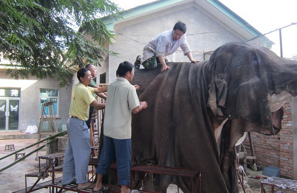 应西双版纳自然保护区请求,昆明动物所立即派遣以踏实认真出名的博物馆标本制作高级工程师罗文寿简装出发,前往版纳自然保护区管理所。罗工程师一到版纳,迅即带领保护区工作人员行动起来,首先测量大象各部尺寸、制作钢筋骨架,接着剥离、削薄、糅制大象皮张,对象皮进行高温蒸煮、…,一天接一天,一周接一周,大象标本的制作在紧张有序地进行着,保护区标本制作室里融洽的气氛与西双版纳冬日暖阳下的天气一样宜人。经过近一个月不间断地工作,一头栩栩如生的大象悄然出现在保护区的展厅里,当地村民看着这头逼真的大象,啧啧赞叹制作技术的高超。这次赴版纳制作大象标本,及时、高效,充分显示了我们与自然保护区密切合作、高度尊重科学的态度以及日臻成熟的制作水平。
