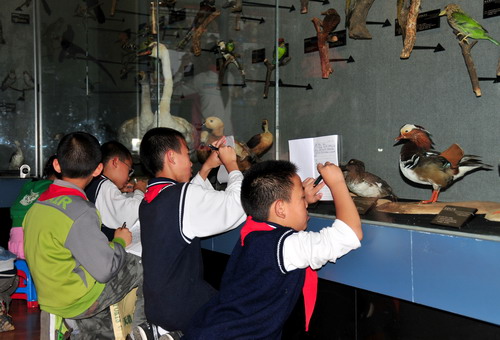璧光小学的同学们进馆后,大家各自带着自己的笔记本分散到馆内的各个展区,认真的记录起了自己感兴趣的动物名字以及分布情况,当他们看到幼儿作品充满了想象力的时候,都纷纷惊叹作品的可爱和童趣,有的同学还说“啥时候也有我们的作品展就好了!”。让同学们流连忘返的还有博物馆热带雨林了,很多同学在走过了两三次后还能在雨林里发现之前没有留意的动物,这让他们感到新奇不已。