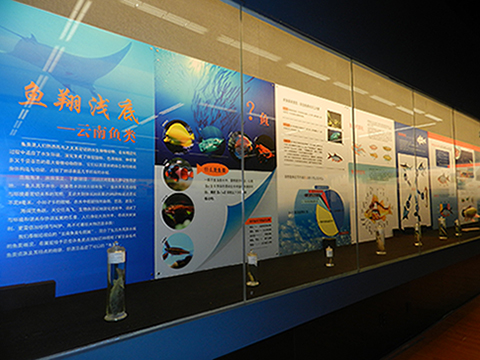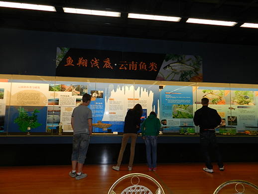 为迎接2012年全国科普日,昆明动物博物馆特别推出““鱼翔浅底——云南鱼类”专题展。展览共分为三部分。第一部分主要讲述鱼类的基本知识,如鱼类的演变、鱼类的行为与生存;第二部分是云南的鱼类与研究;最后是鱼类文化。同时,还在展板下方陈列了部分动物所保存多年的珍贵的鱼类标本。通过这一专题展,简要介绍了生活在高原水域的鱼类概况,并集中展示了昆明动物所近五十年来在鱼类研究领域取得的科研成果和最新进展。