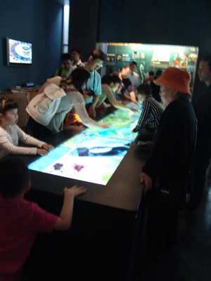 一楼新增多点触摸系统(桌面互动),采用最先进的多人触控技术,最多可以有16位观众参与互动,实现多人多点的精确人机交互却且互不干扰,配合大尺寸显示屏显示绚丽的交互画面,令观众在触觉、视觉、听觉以及人机交互感知方面获得极大冲击力。