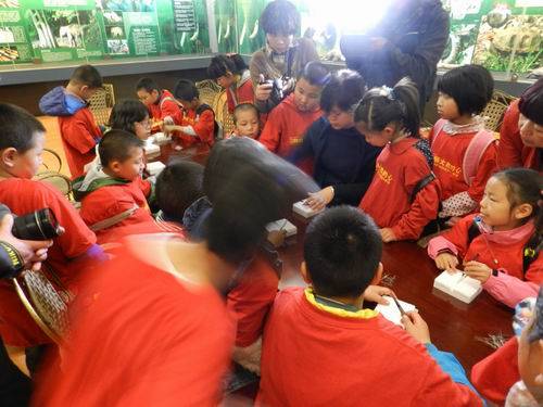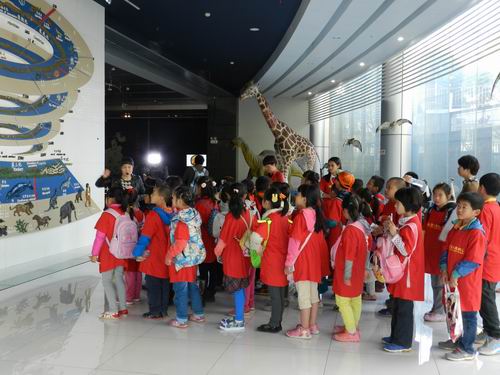 孩子们刚进到大厅,等候多时的工作人员将38个小朋友分为4组,带领他们顺序在博物馆内参观、讲解相关的动物。博物大厅刚刚做好的长颈鹿吸引了他们目光,成为最受欢迎的动物之一;下午2点到4点,兴致勃勃的孩子们在老师的指导下,制作昆虫标本,他们认真、好学的态度迎得了老师的阵阵赞许。