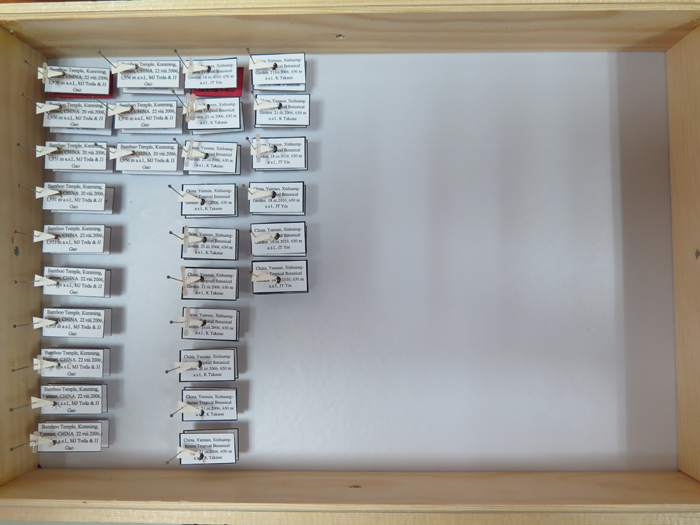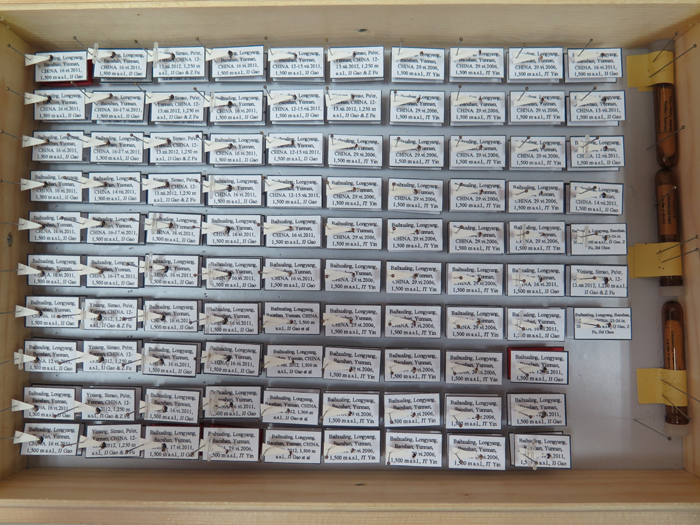 近日,云南大学高建军副研究员、西南林业大学硕士生李楠楠向昆明动物博物馆昆虫标本库存放了他们及合作者近年来发表的9个果蝇新种(分别来自果蝇属Drosophila、芋果蝇属Colocasiomyia和毛果蝇属Hirtodrosophila)的共196号标本,其中模式标本194号(含正模9号),定名标本2号。高建军副研究员多年从事果蝇分类和系统发生学研究,这是他继2012年将3种共22号果蝇副模标本保存于昆明动物博物馆昆虫标本库以来,再次向昆明动物博物馆存放果蝇模式标本。这批标本的入库丰富了昆明动物博物馆模式标本的收藏。
