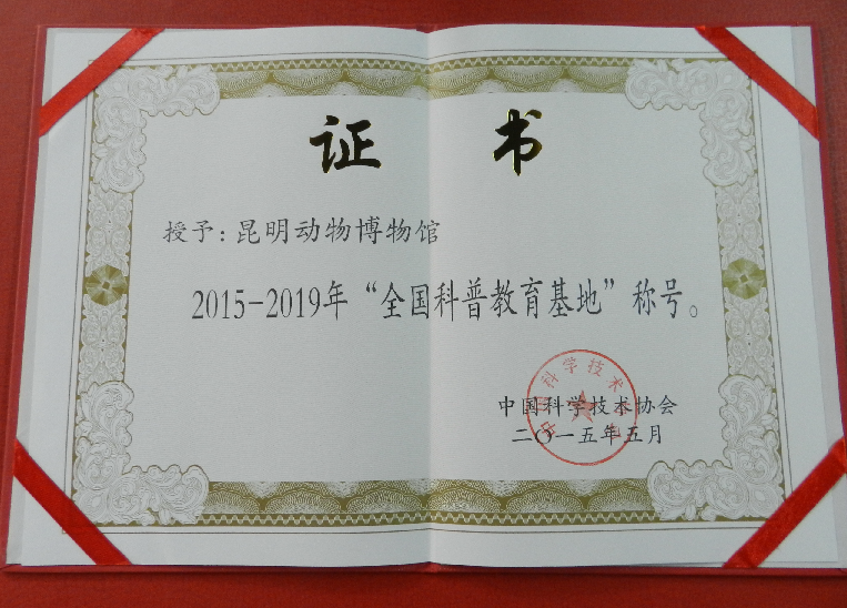 日前,中国科协办公厅公布了2015-2019年全国科普教育基地评审认定结果,昆明动物博物馆再次获批“全国科普教育基地”称号并被授予了牌匾和证书。昆明动物博物馆从2010年起被认定为全国科普教育基地,一直发挥科普功能,不断改善展陈条件,提高服务质量,积极开展了多种形式的科普工作,赢得了良好的社会声誉。