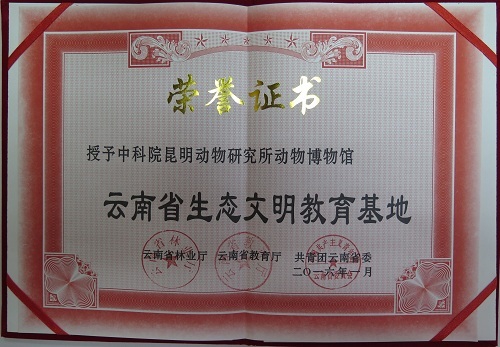 2016年1月中科院昆明动物研究所动物博物馆荣获云南省生态文明教育基地授牌和证书。
